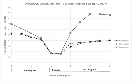 This retrospective cohort study analyzed data extracted from the Tel Aviv Sourasky Medical Center (TASMC) General ICU database (MetaVision, IMDsoft) between 2017–2023. In this study, oliguria was defined as two consecutive hours of urine output less than 20 mL/h following at least three hours with urine output greater than 20 mL/h. We selected this lower threshold to identify oliguria episodes more sensitively. Furthermore, the threshold we chose aligns closely with our clinical practice, as oliguria episodes are usually reported by nursing staff when urine output decreases to approximately 20 mL/h over two or more hours. Urine output was measured routinely every hour using a closed urinary collection system with a graduated urometer, allowing accurate measurement in increments as small as 5 mL. Physician reactions to oliguria were classified into three categories: no reaction (observation without intervention), administration of a fluid bolus (>250 mL) [14,15,16], and administration of furosemide, all within four hours from documented oliguria.