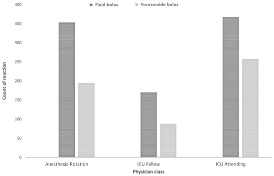 The distribution of treatment choices among different physician categories, along with corresponding case counts, was as follows: Anesthesia rotation physicians (n = 547) opted for a fluid bolus in 64.5% of cases and a furosemide bolus in 35.5%; ICU fellows (n = 258) chose a fluid bolus in 65.9% of instances and a furosemide bolus in 34.1%; ICU attending physicians (n = 624) selected a fluid bolus for 58.8% of episodes and a furosemide bolus in 41.2% of cases (p = 0.055).