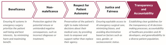 Unlike elective surgeries, emergency procedures often occur under circumstances where obtaining informed consent is challenging. AI integration adds another layer of complexity, as patients may not fully understand its role in their treatment. Studies have indicated that patients prefer transparency regarding AI involvement in their care and show increased trust when AI systems are disclosed and explained [51,52]. Furthermore, evidence suggests that when patients are adequately educated about AI’s role, their acceptance and confidence in AI-assisted procedures significantly improve, highlighting the necessity for transparency in AI deployment [53]. Beyond informed consent, AI integration in surgery must align with core ethical principles, particularly the respect for patient autonomy. Ethical concerns arise when AI-driven decisions conflict with individual patient values, potentially leading to recommendations that may not fully reflect personal preferences. This underscores the critical need for AI systems that are not only explainable but also adaptable to patient-centered care. Ensuring that AI remains a supportive tool rather than a substitute for human judgment is essential to maintain ethical integrity in emergency surgical settings [54].
