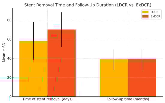 Time of stent removal and follow-up duration in revision EnDCR (LDCR vs. ExDCR).