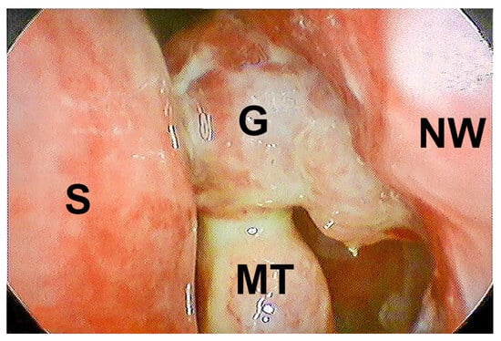Ostium closure due to granulation (left side; G—granuloma at ostium; NW—nasal wall; S—septum; MT—middle turbinate).