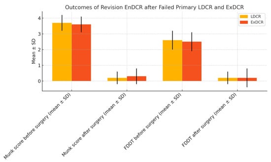 Additionally, clinical parameters related to the healing process—such as endoscopic assessment of ostium size and results of lacrimal syringing—were analyzed descriptively in relation to the type of primary surgical procedure.