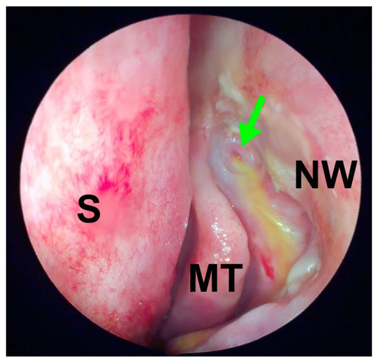 Patent ostium after revisional EnDCR due to previous failed ExDCR (left side; 6 weeks after surgery; green arrow—common canalicular opening; NW—nasal wall, MT—middle turbinate, S—septum; note yellowish fluorescein fluid coming out of common canalicular opening).