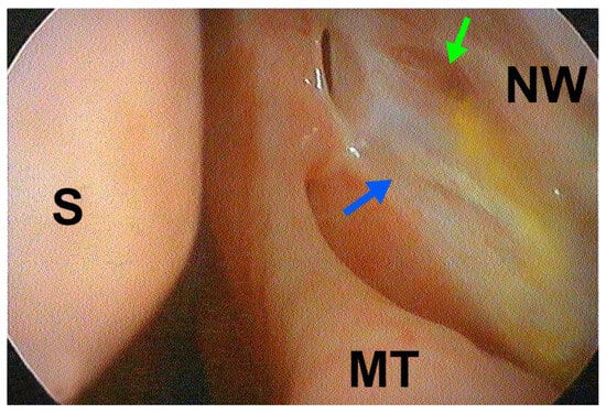 Healed patent ostium after revisional EnDCR due to previous failed LDCR, with ostium scarring being the cause of occlusion (left side; 16 weeks after surgery; green arrow—common canalicular opening, blue arrow—scarring at ostium edges; NW—nasal wall, MT—middle turbinate, S—septum; note yellowish fluorescein fluid coming out of common canalicular opening).