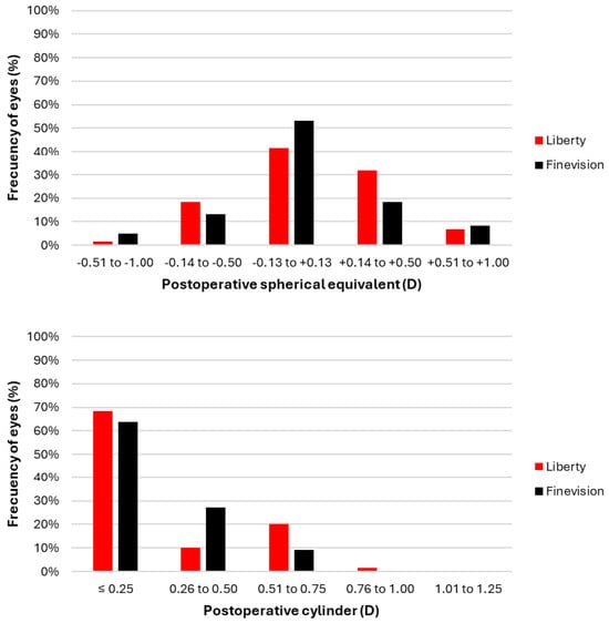 Figure 1 shows the refractive outcomes in terms of spherical equivalent and cylinder for both lenses, 3 months after surgery. A total of 91.7% of patients implanted with the Liberty lens and 85.0% of those with the Finevision lens achieved a spherical equivalent within ±0.50 D. Regarding cylinder values, 78.3% of patients had values ≤ 0.50 D with the Liberty lens, compared to 90.9% with the Finevision lens. The mean residual sphere was +0.09 ± 0.32 D for the Liberty lens and +0.08 ± 0.44 D for the Finevision lens, with no significant differences between the two lenses (p = 0.953). Similarly, the mean residual cylinder was −0.32 ± 0.28 D for the Liberty lens and −0.27 ± 0.29 D for the Finevision lens, also showing no significant differences between them (p = 0.342).