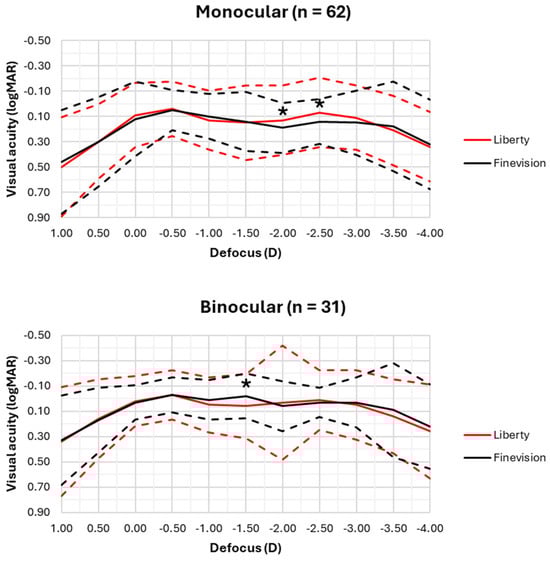 Monocular and binocular defocus curves for both intraocular lenses, 3 months post-surgery. The dashed lines represent the 95% confidence intervals (CI) of visual acuity at each defocus level. The 95% CI is mathematically defined as 2.77 × the standard deviation and represents the range of visual acuity that can be expected for 95% of the patients implanted with each of the lenses. * p < 0.05, Mann–Whitney U test.