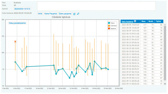 An example of a graph showing the blood pressure and the heart rate of a patient participating in telerehabilitation.