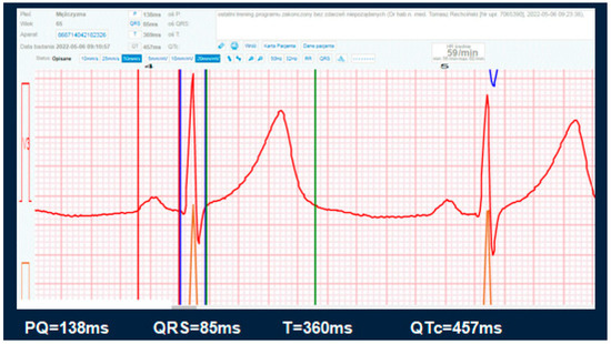 On days 3, 4, and 5 of the programme, patients from the study group were educated on how to use the telerehabilitation device. This included learning how to use the telerehabilitation monitoring equipment: measuring heart rate, blood pressure, body mass, following the planned exercise programme, and assessing their level of exertion according to the Borg scale. The patients also took part in meetings with a psychologist, who helped them to cope with possible symptoms of depression and anxiety related to the disease, and with a dietitian, who taught them the principles of preparing a healthy diet. On days 6–23, the actual rehabilitation of the patients took place. The training protocol was standardised for all patients. The training consisted of marching under heart rate control (the patients were advised to reach a training heart rate limit). Before each training session, during a telephone conversation, the patients answered questions about their current health, well-being, and medications taken. Then, they sent their resting ECG record as well as their blood pressure and body mass measurements to the monitoring centre—the doctor also had all previous measurements in the form of a graph (see Figure 1). The resting ECG was sent to the centre twice before the start of training, and then at 20 min intervals and after the training. In the transmitted ECG, it was possible to assess heart rhythm: whether it was sinus rhythm or not, whether there were arrhythmias (e.g., atrial fibrillation, premature ventricular or supraventricular extrasystoles). The system also allowed the measurement of the duration of the PQ interval, of the QT interval and of the QRS complex (Figure 2). If there were no contraindications, the patient received consent to start the training session. The telerehabilitation ECG was monitored several times during each session. For stationary patients, ECG was performed during the first three days of the programme and then only in the case of emerging complaints (palpitations, retrosternal pain). In order to improve exercise capacity, three forms of exercise were recommended: endurance training, respiratory muscle training, and resistance and stretching training. On the last day, a final exercise ECG test was performed according to the Bruce–Ramp protocol.