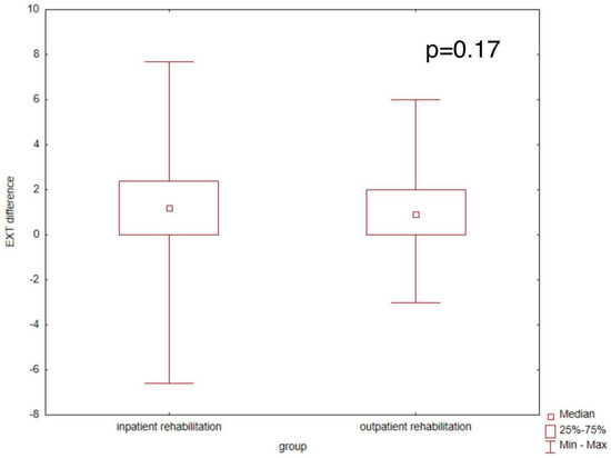 A comparison of patients from the inpatient rehabilitation group and patients participating in telerehabilitation in terms of increased exercise capacity. Y−the difference between the exercise capacity in the final exercise test and the result in the initial exercise test.