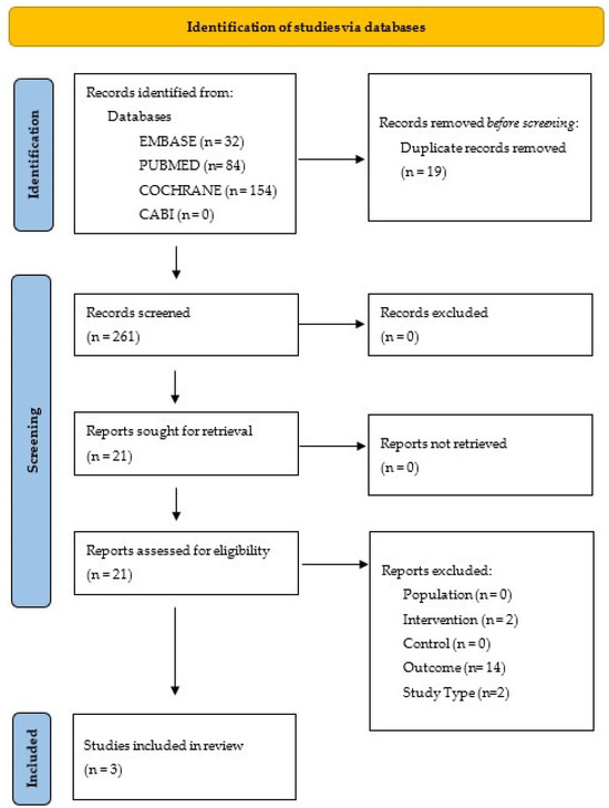 Two hundred and eighty references were found in total. Nineteen duplicate references were removed; the remaining two hundred and sixty-one references were then assessed by two blinded reviewers, and any disagreements were settled by a third independent reviewer. Twenty-one references were reviewed at the full paper stage, and from this, only three met the PICOS eligibility criteria (Table 1) for inclusion in this review (Figure 1).