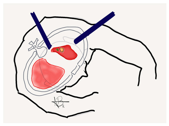 Key technical considerations include ensuring that the marking is placed close to the pleural surface, ideally within the area corresponding to the intended surgical resection line, to allow the thoracic surgeon to perform a wedge resection with clear margins. Moreover, the marker should be no more than 1 cm from the visceral pleura, as this proximity is necessary for the ICG signal to be reliably visualized during the intraoperative robotic surgical portion (Figure 2) [12].