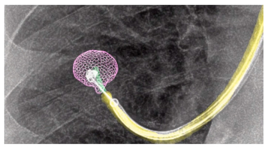 Illustrative fluorosocopy findings of the augmented lung nodule in pink and the augmented bronchoscope in yellow, with the life deployment of the marking coil into the lung nodule under live fluoroscopy.