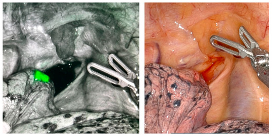 Intraoperative localization of a lung nodule using near-infrared fluorescence imaging with indocyanine green (ICG). (Left): Firefly™ near-infrared mode reveals a bright green, fluorescent signal at the site of the ICG-marked lung nodule, enabling precise intraoperative identification. (Right): standard white-light view of the same anatomical region without fluorescence.
