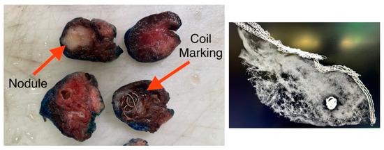 Confirmation of complete lung nodule resection using fluoroscopy and gross pathology. (Left): gross pathological specimen showing the resected lung nodule and the indocyanine green (ICG)-soaked coil used for intraoperative localization. The nodule (labeled) is fully contained within the resection margins, with the coil marker embedded adjacent to the lesion, confirming accurate targeting. (Right): intraoperative fluoroscopic image of the resected specimen displaying the coil marker within the tissue, verifying successful localization and resection of the intended lesion.