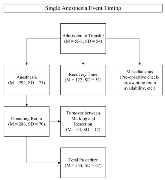As represented in Figure 6, the utilization of time was recorded, averaged, and categorized into the overarching task. The time-related benefits of combining the two procedures include not having to repeat recovery time, which took a mean of 122 min, and miscellaneous time, which, although not measured, can be estimated to be about 142 min. This calculated mean is based on subtracting the mean “admission to transfer” time from the “anesthesia” plus “recovery” time. On the contrary, the time cost of performing the two procedures together is best represented as the “turnover time between marking and resection” with a mean of 33 min and standard deviation of 17 min. In total, combining the procedures provided a net benefit of approximately 231 min. Notably, the turnover time number decreases immensely if the first attempt at combining the two events is not included, as it took 82 min. Turnover time improves to a mean of 28 min with a standard deviation of 8 min when removing this attempt, which was slowed by the lack of experience amongst supporting staff during the change in the procedural process. Therefore, this total time benefit likely underestimates the true benefit conferred.
