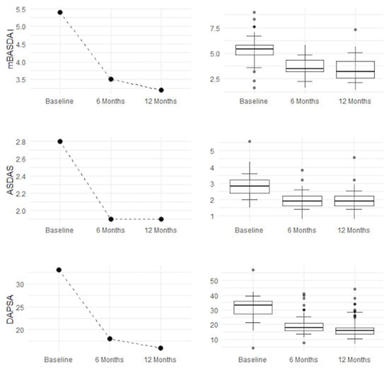 The results, presented in Table 3 below, indicate that all clinimetric measures showed highly significant improvements across the entire follow-up period and in pairwise comparisons between successive time points, except for ASDAS scores at 6 and 12 months, where no significant difference was observed. This suggests that the significant reduction in ASDAS scores occurred entirely within the first 6 months, with no further significant change between 6 and 12 months. Treatment success was defined as the achievement of statistically significant and consistent improvement in validated disease activity scores (DAPSA, ASDAS, and mBASDAI) and SPARCC MRI inflammation scores, reflecting both clinical and imaging responses.