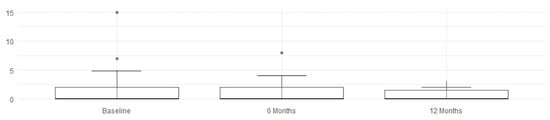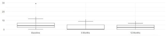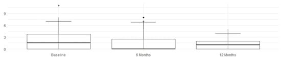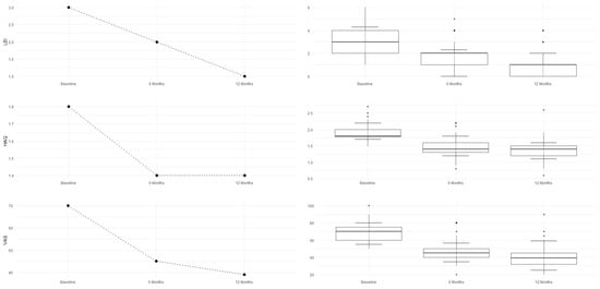 First, the Friedman test was used to assess whether the overall changes from baseline to 12 months were statistically significant. Given the significance of these results, further analyses were conducted to evaluate improvements between successive follow-up time points using the Wilcoxon signed-rank test.