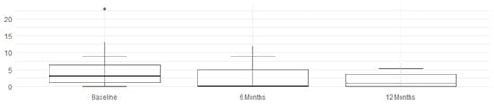 The MRI assessment results for four parameters regarding SPARCC were right score, left score, L + R score, and intensity, analyzing the changes from baseline (t0) to the follow-ups at 6 months (t6) and 12 months (t12). According to the Friedman test, shown in Table 5, the p-values for left score, L + R score, and intensity are ≤0.0024, indicating a statistically significant difference across time points. The right score has a p-value of 0.0175, which is less significant than for the other parameters but still below the threshold of p < 0.05—indicating a specific and effective improvement, as detected by imaging. The intensity of inflammation (intensity) continues to decrease up to 12 months, suggesting a possible prolonged therapeutic effect. When examining the confidence intervals (CIs), a statistically significant improvement is observed during the first 6 months for all evaluated scores, followed by a consolidation of the results by 12 months.