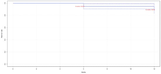 Guselkumab retention rate (Kaplan–Meier). Red squares indicate the cumulative retention rate measured at 6-month and 12-month follow-up points.