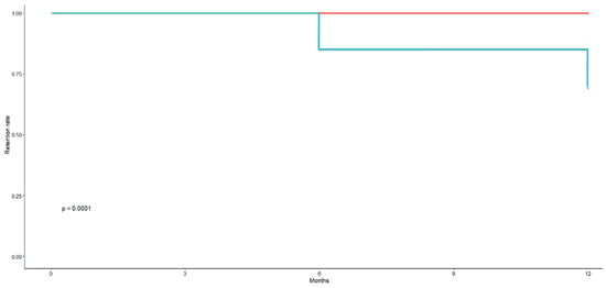 Red line → Patients without fibromyalgia maintain a high retention rate up to 12 months.