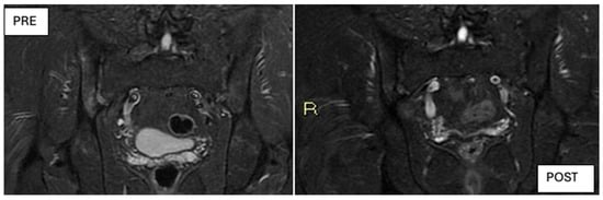 MRI of the SI joints was performed using a 3T MRI scanner (Siemens Magnetom Vida, Siemens Healthineers, Forchheim, Germany) with appropriate 16-channel surface coils. The sequence protocols were as follows: coronal (along the long axis of the sacral bone) T1-weighted (T1W) spin-echo (SE) (time to repeat/echo time [TR/TE], 362/9 ms; matrix, 256 166; slice thickness, 3 mm; field of view [FOV] 250; flip angle [FA], 150), and coronal fat-saturated (FS) T2-weighted (T2W) SE (TR/TE, 2460/62 ms; matrix, 256 166; slice thickness, 3 mm; FOV, 250; FA 150).
