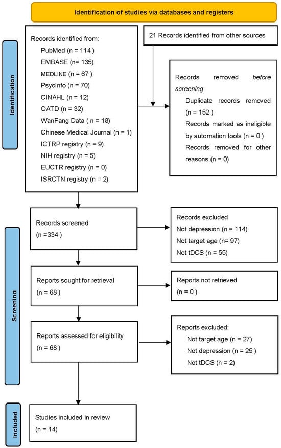 The initial search generated 486 studies from databases and registries, as seen in PRISMA (Figure 1). After removing duplicates, 334 papers remained for title and abstract screening. In total, 68 records were assessed for eligibility (52 original research papers, 16 trial registrations), and 14 remained for review. The majority were excluded due to individuals not having depression and not being targeted at the appropriate age. Of the identified studies, two studies were published clinical trials; four studies were case reports; and eight studies were clinical trials registered in registries.