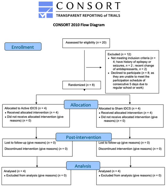 The trial was prospectively registered in clinicaltrials.gov (ID: NCT06518642). The study was approved by the Institutional Review Board of the University of Hong Kong/Hospital Authority Hong Kong West Cluster (HKU/HA HKW IRB Reference Number: UW 24–035). The Consolidated Standards of Reporting Trials (CONSORT) flowchart is presented in Figure 2, and the CONSORT checklist for pilot or feasibility randomised trials is presented in Supplementary Materials Table S3. This is a randomised, double-blind (participant, outcome accessor), sham-controlled trial with two assessment time points: baseline (T0) and post-intervention (T1). Participants were randomly assigned to receive either active or sham tDCS by the principal investigator, with sessions conducted over five consecutive days. The randomisation ratio was 1:1 between the two groups.