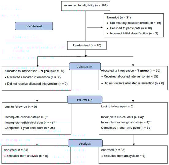 CONSORT flow diagram of assignment to group T (additional tape augmentation) and group N (no additional augmentation). CONSORT, Consolidated Standards of Reporting Trials. * Patients have not fulfilled questionnaires or data in physical form have been lost prior to transforming them into a digital spreadsheet. ** Alexander view X-rays had not been taken at the 3- or 6-month time points, or substandard quality projections were obtained and were not applicable for measurements.