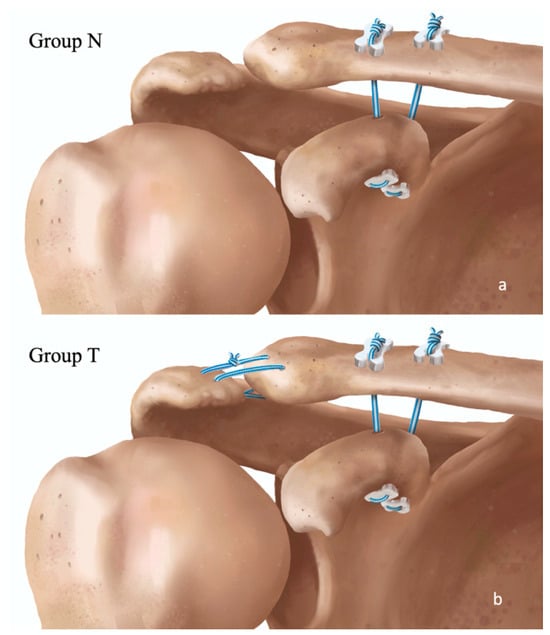 All surgeries were performed by one of two senior shoulder surgeons (M.A. and K.O.). Open reduction of the AC joint was performed with arthroscopically assisted drilling of bone tunnels in place of conoid and trapezoid ligaments (4.5 and 2.5 cm from the lateral clavicle end) and into the base of the coracoid. Two suspensory systems were shuttled in a retrograde direction and knotted over two additional buttons on the superior side of the clavicle (Figure 2 and Figure 3). In group T, a non-absorbable tape was also placed through bone tunnels on each side of the AC joint and tied firmly (Figure 2 and Figure 3b). Because of the acute setting, no additional biological material was incorporated in the construct [35]. AC capsule repair was incorporated in the muscle–fascia suture closure in all patients in both groups. A detailed description of the surgical technique is available in the Supplementary Materials.