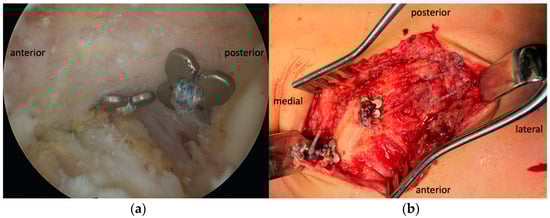 Dog Bone buttons with tapes on the undersurface of the coracoid base—arthroscopic view (a), Dog Bone buttons with knotted tapes on the superior side of the clavicle and AC joint augmentation with parallel tape strands on the superior side, with a knot positioned posteriorly (b).
