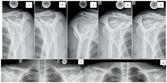 Modified Alexander view with the arm in a cross-body adduction position (a–e), bilateral Zanca projection (f,g). Unaffected shoulder with a demonstration of OL (a) and OA measurements (b), complete horizontal translation with overriding clavicle, with a demonstration of a negative OL measurement (c), AC joint after reduction and fixation with a double suspensory system and OL (d) and OA measurements (e), complete AC joint dislocation on the left side (Rockwood type V) with CC measurements (f), AC joint after reduction and fixation with intended overreduction on the left side and CC measurements (g). OL—overlapping length; OA—overlapping area; CC—coracoclavicular distance.