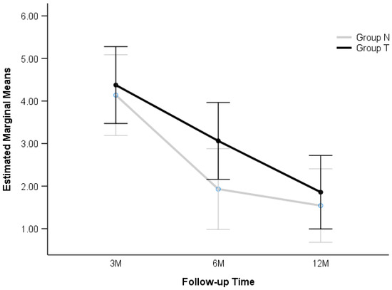 Despite overall similar outcomes produced with PROMs, there were some minor but noted clinical differences between groups. A lower level of pain was recorded in group N at 6 months (U = 531, p = 0.046; Mann-Whitney U Test). No statistically significant differences were observed between the groups at 3 months (p = 0.298) or 12 months (p = 0.236). Factorial ANOVA was additionally used to assess changes over ”follow-up time” and interaction effects. It showed a substantial decrease in pain level over time (F (2186) = 16.335, p < 0.001). However, the overall level of pain was not significantly different between groups when considering all postoperative records (F (1186) = 2.238, p = 0.136). The pattern of pain reduction was similar over time for both groups (F (2186), p = 0.568), suggesting that the estimated marginal means in group T were slightly higher (3.098) than those of group N (2.537), but this difference was not statistically significant (Figure 5).