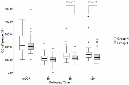 Statistically significant lower values of CC differences in group T were observed at 6 months (p = 0.047) and 12 months after surgery (p = 0.046; Mann–Whitney U test) (Figure 6; Table S3).