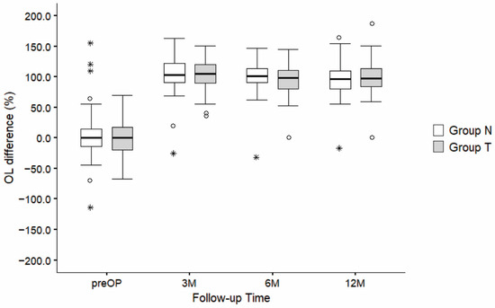 Comparison of relative OL difference (%) between group N and group T at different follow-up times (before surgery, 3 M, 6 M, and 12 M after surgery). Statistically significant differences were identified using the post-hoc Tukey test (p < 0.001). The boxplots represent the distribution of OL difference (%) for groups N and T, with horizontal lines showing the median values and whiskers representing 1.5 times the interquartile range (IQR). Outliers are displayed as circles (o), while asterisks (*) indicate extreme values. M—months.