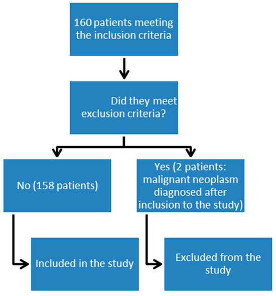 The study recruited patients visiting our clinic between 2013 and 2020 with the first signs and symptoms of disease or relapse, and they were enrolled before commencing any intensive treatment (e.g., cyclophosphamide and steroid pulses). All the patients in the study received no drugs at the moment of inclusion and within the preceding 6 months. Due to the study design, there was no randomization. Only patients with a histopathologically confirmed diagnosis of membranous nephropathy, FSGS (focal and segmental glomerulosclerosis), LN (lupus nephritis), IgA nephropathy, non-IgA mesangial proliferative glomerulopathy, cytoplasmic (c-ANCA) or perinuclear (p)-ANCA-positive anti-neutrophil cytoplasmic antibody vasculitis were included. Moreover, proteinuria in the last accessible urine evaluation was required for the patient to be included. Patients with a history of current or previous malignancy, dialysis, or kidney transplantation, and those with active infections were excluded from the study. The control group comprised 22 healthy individuals of Caucasian origin who met the criteria of having no proteinuria, creatinine levels at or below 1.3 mg/dL, CRP levels under 5 mg/dL, and no history of kidney, autoimmune, or neoplastic disorders in anamnesis. Figure 1 displays a flowchart outlining the process of participant inclusion in the study.
