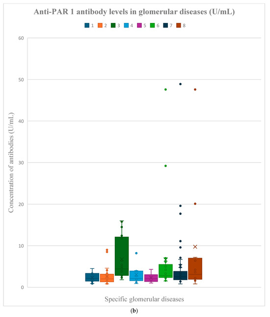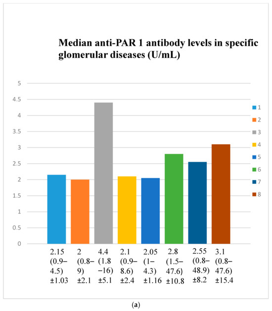 (a). Median anti-PAR 1 antibody levels in specific glomerular diseases (U/mL). (b). Anti-PAR 1 antibody levels in specific glomerular diseases (U/mL). The bars with colours labelled by numbers 1–8 represent values of anti-PAR 1 antibodies in patient groups 1–8, respectively (the same groups as in Figure 2a). The y-axis represents the concentration of antibodies (U/mL). Points represents specific patients. X-presents median value. Key for the (a,b): 1—membranous nephropathy (n = 18); 2—focal and segmental glomerulosclerosis (n = 25); 3—lupus nephritis (n = 17); 4—IgA nephropathy (n = 14); 5—mesangial proliferative (non-IgA) glomerulonephritis (n = 6); 6—control group (n = 22); 7—c-ANCA vasculitis (n = 40); and 8—p-ANCA vasculitis (n = 16). Median values are presented under the bars, ranges are values in brackets, and ± represents the standard deviation.