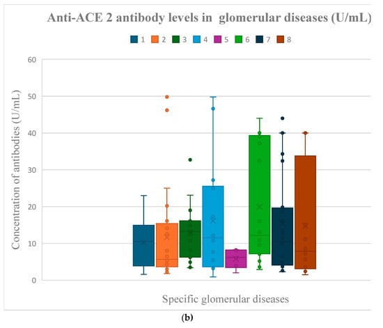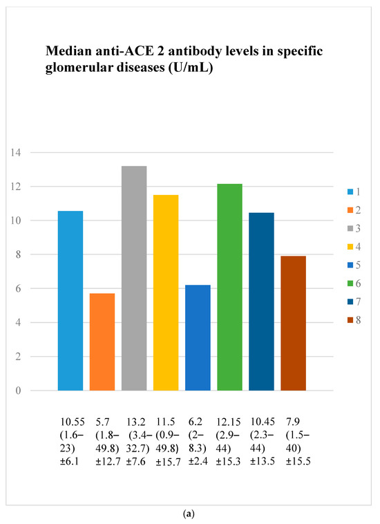 (a). Median anti-ACE 2 antibody levels in specific glomerular diseases (U/mL). (b). Anti-ACE 2 antibody levels in specific glomerular diseases (U/mL). The bars with colours labelled by numbers 1–8 represent values of anti-ACE 2 antibodies in patient groups 1–8, respectively (the same groups as in Figure 2a). The y-axis represents the concentration of antibodies (U/mL). Points represents specific patients. X-presents median value.