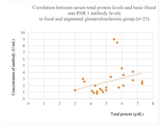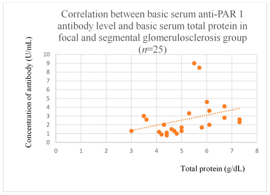 Correlation between basic serum anti-PAR 1 antibody level and basic serum total protein level in focal and segmental glomerulosclerosis group (r = 0.52; p = 0.009). Orange dots represent particular patients. Orange dotted line—trend line.