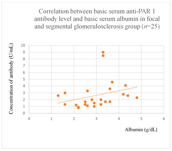 Correlation between basic serum anti-PAR 1 antibody level and serum albumin level after 1 month of observation in focal and segmental glomerulosclerosis group (r = 0.43; p = 0.03). Orange dots represent particular patients. Orange dotted line—trend line.