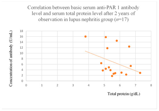 Correlation between basic serum anti-PAR 1 antibody level and serum total protein level after 2 years of observation in lupus nephritis group (r = −0.64; p = 0.005). Orange dots represent particular patients. Orange dotted line—trend line.