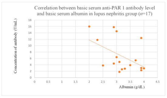 Correlation between basic serum anti-PAR 1 antibody level and serum albumin level in lupus nephritis group (r = −0.5; p = 0.04). Orange dots represent particular patients. Orange dotted line—trend line.