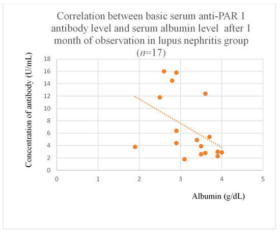 Correlation between basic serum anti-PAR 1 antibody level and serum albumin level after 1 month of observation in lupus nephritis group (r = −0.52; p = 0.03). Orange dots represent particular patients. Orange dotted line—trend line.