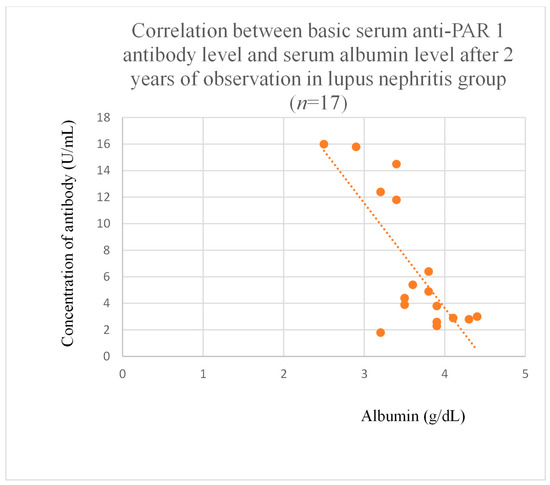 Correlation between basic serum anti-PAR 1 antibody level and serum albumin level after 2 years of observation in lupus nephritis group (r = −0.66; p = 0.004). Orange dots represent particular patients. Orange dotted line—trend line.