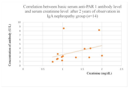 Correlation between basic serum anti-PAR 1 antibody level and serum creatinine level after 2 years of observation in IgA nephropathy group (r = 0.63; p = 0.02). Orange dots represent particular patients. Orange dotted line—trend line.