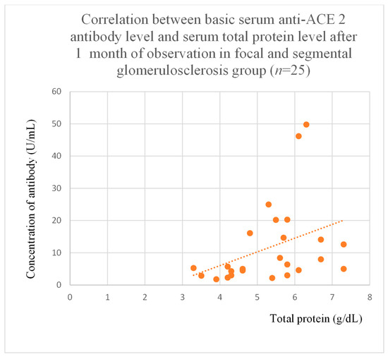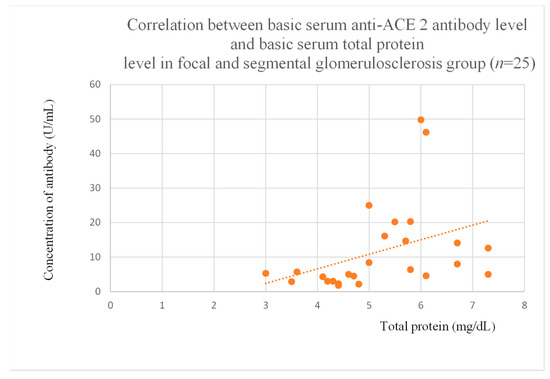 Correlation between basic serum anti-ACE 2 antibody level and basic serum total protein level in focal and segmental glomerulosclerosis group (r = 0.56; p = 0.003). Orange dots represent particular patients. Orange dotted line—trend line.