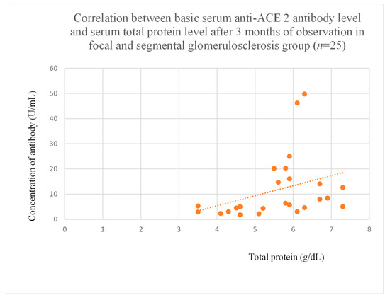 Correlation between basic serum anti-ACE 2 antibody level and serum total protein level after 3 months of observation in focal and segmental glomerulosclerosis group (r = 0.47; p = 0.03). Orange dots represent particular patients. Orange dotted line—trend line.