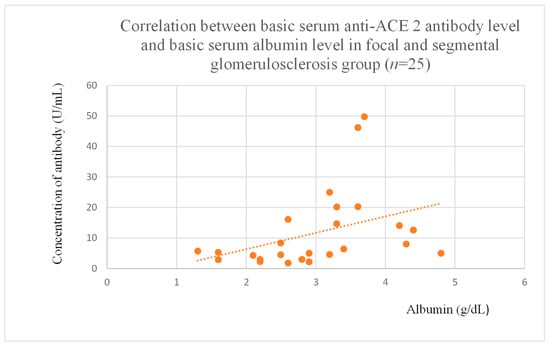 Correlation between basic serum anti-ACE 2 antibody level and basic serum albumin level in focal and segmental glomerulosclerosis group (r = 0.54; p = 0.004). Orange dots represent particular patients. Orange dotted line—trend line.