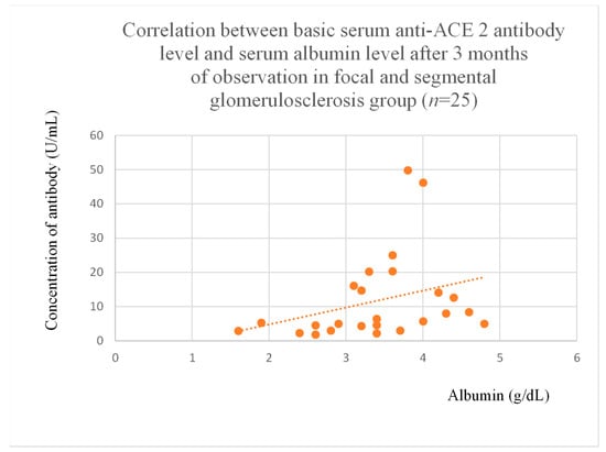Correlation between basic serum anti-ACE 2 antibody level and serum albumin level after 3 months of observation in focal and segmental glomerulosclerosis group (r = 0.45; p = 0.04). Orange dots represent particular patients. Orange dotted line—trend line.