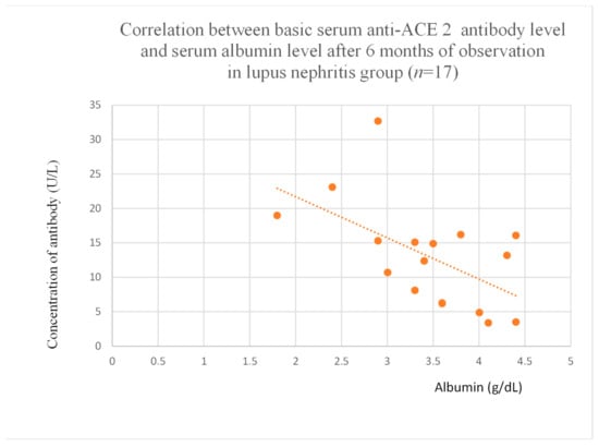 Correlation between basic serum anti-ACE 2 antibody level and serum albumin level after 6 months of observation in lupus nephritis group (r = −0.68; p = 0.009). Orange dots represent particular patients. Orange dotted line—trend line.