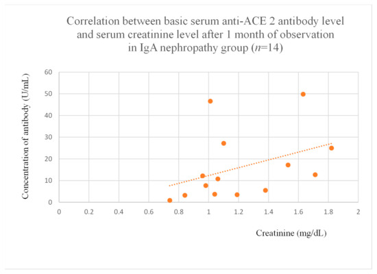 Correlation between basic serum anti-ACE 2 antibody level and serum creatinine level after 1 month of observation in IgA nephropathy group (r = 0.55; p = 0.04). Orange dots represent particular patients. Orange dotted line—trend line.